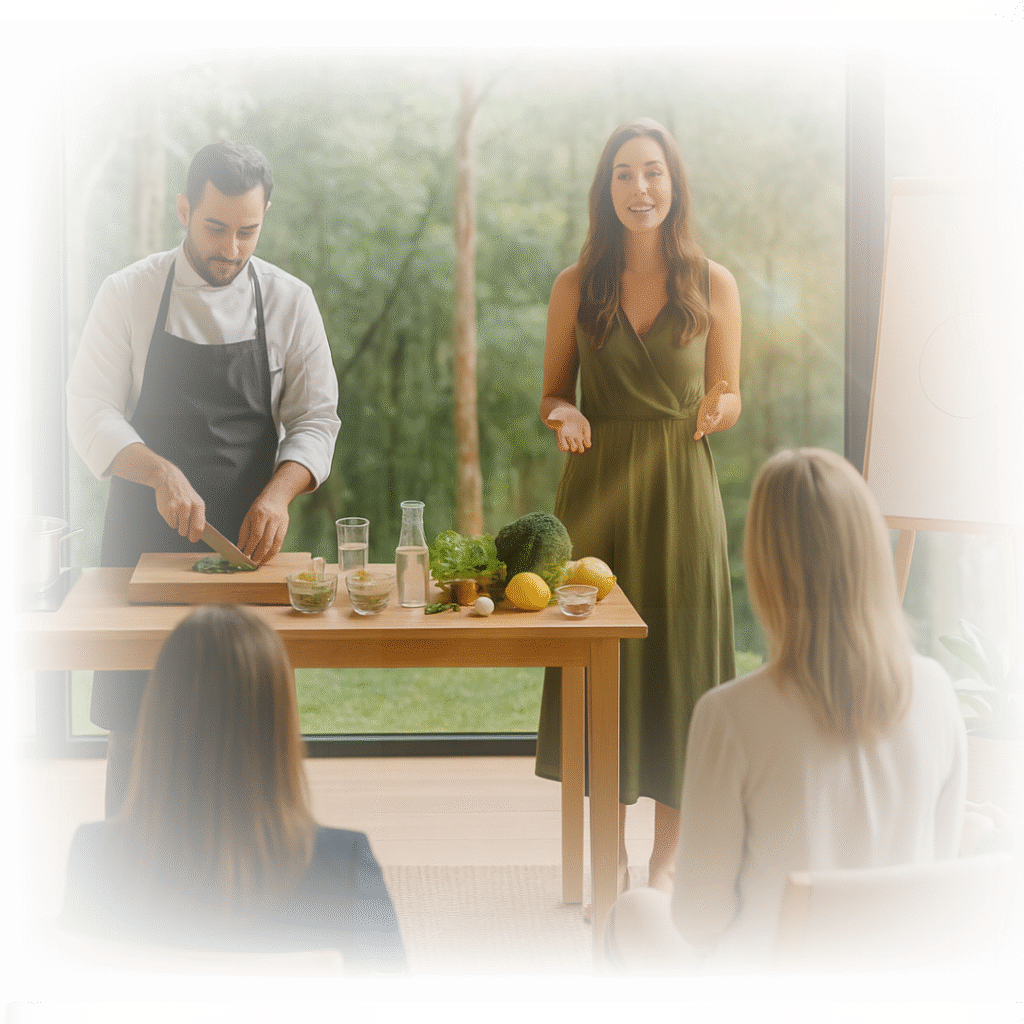 Durante o programa, os participantes acompanham e aprendem na prática a preparação de alimentos funcionais, vivenciam o sabor como ferramenta de cura e têm contato direto com a filosofia da gastronomia de longevidade.